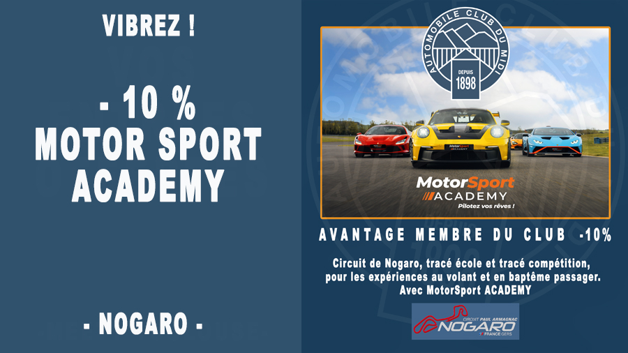 AVANTAGE – 10% Circuit Nogaro, tracé école et tracé compétition, pour les expériences au volant et en baptême passager avec MotorSport ACADEMY ! (Pour les bons de validité de 8 et de 12 mois) Contactez le Club avec votre numéro d’adhérent pour connaître votre code promo. Stage de Pilotage au volant Circuit de Nogaro : https://www.motorsport-academy.fr/stage-pilotage-circuit/nogaro/ Baptême en […]