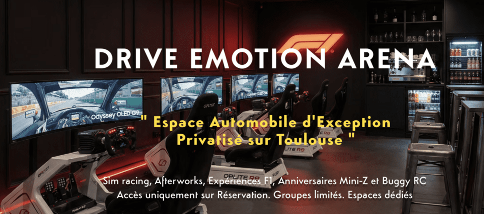 Dans un espace bien délimité au sein du pôle SOUPAPES (conciergerie automobile) DRIVE EMOTION ARENA est un mini complexe de jeux. Destiné au particuliers et aux professionnels, individuel, groupe, club, CE , …  Enfants, Ado, adultes … À tous les pilotes en herbe et fans de Formule 1, désireux de passer des moments uniques grâce à des instalations inovantes . Circuit Mini Z, Buggy RC et simulateurs « SIM RACING » ! Tarifs préférentiels membres Automobile Club du Midi, pensez à le préciser.