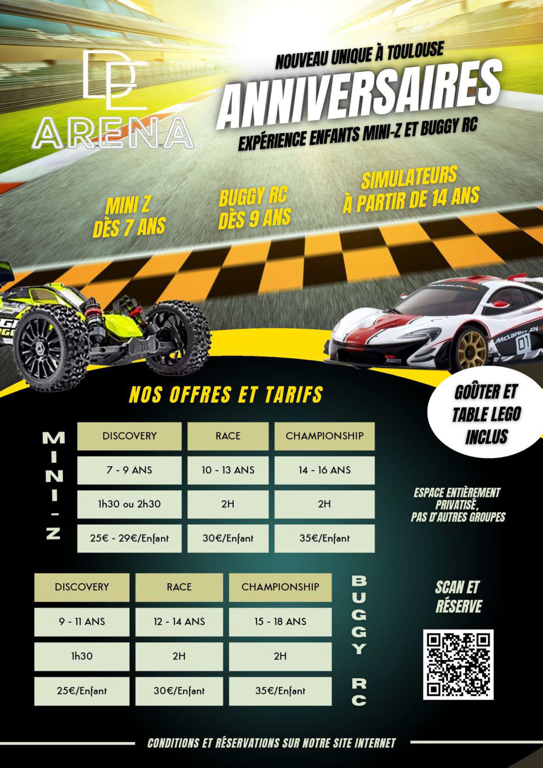 Une formule anniversaire automobile destinée aux enfants à partir de 7 ans. Les participants découvrent le pilotage de voitures Mini-Z sur circuit, à travers des courses et défis ludiques, encadrés et adaptés à leur âge. Un circuit Carrera et une table LEGO sont également mis à disposition afin de permettre une prise en main progressive et un temps de jeu complémentaire.