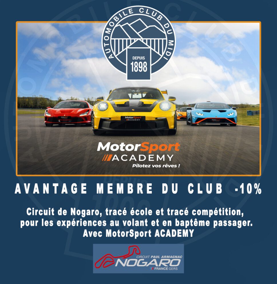 AVANTAGE – 10% Circuit Nogaro, tracé école et tracé compétition, pour les expériences au volant et en baptême passager avec MotorSport ACADEMY ! (Pour les bons de validité de 8 et de 12 mois)